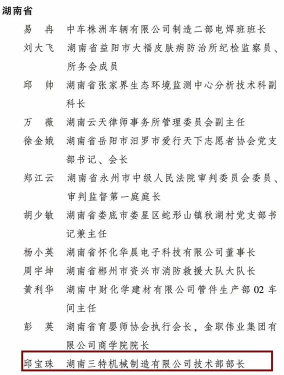 • 為表彰先進、樹立榜樣,進一步引領和激勵廣大婦女堅定不移聽黨話、跟黨奮進新征程,豪情滿懷、意氣風發投入推進中國式現代化的偉大實踐,日前,全國婦聯決定授予10人全國三八紅旗手標兵稱號,298人全國三八紅旗手稱號,授予199個單位全國三八紅旗集體稱號,其中,來自桃源的湖南三特機械制造有限公司技術部部長 邱寶珠 獲得全國三八紅旗手榮譽。